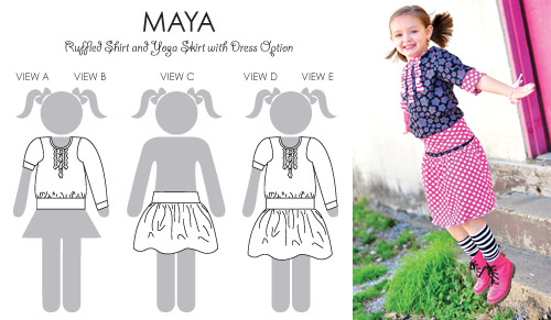 Maya is a comfy and flirty two-piece set. The shirt has wide cuffs on the sleeves and a stretchy waistband to give it that “bubble” look and features a series of mini ruffles around the chest for a touch of whimsy. The yoga skirt is simply the most versatile and comfortable piece of clothing your child will own... perfect for school, dance class or just playing around. And best of all, you can easily sew the yoga skirt to the shirt’s waistband to make a one-piece Maya dress!